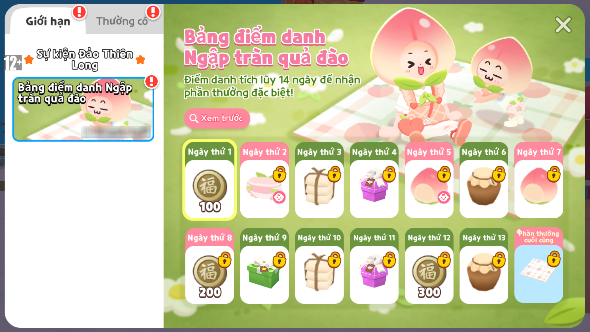 Đăng nhập 14 ngày liên tiếp để nhận Tấm trải picnic Trái Đào và Bộ trang phục Trái Đào!
