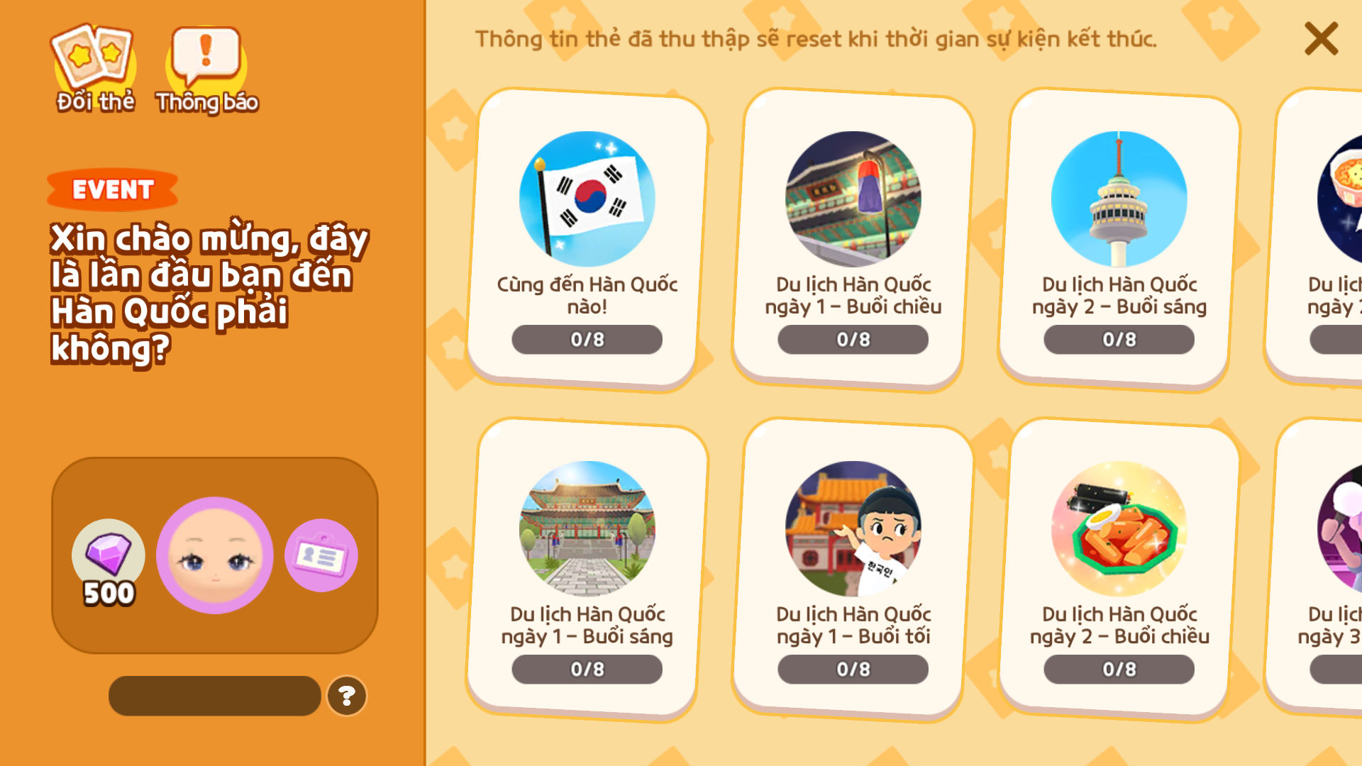 Thu thập thẻ để nhận Bảng tên “Tinh thần Hàn Quốc” và “Mặt xinh đẹp” cùng nhiều phần thưởng khác.