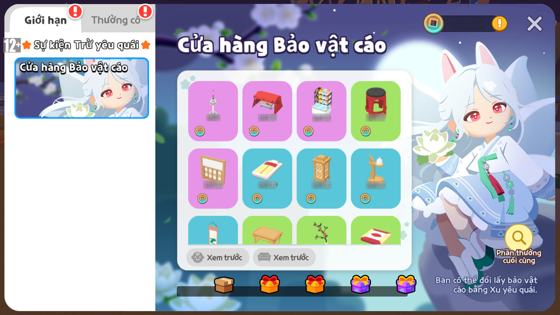 Hãy dùng Xu yêu quái thu thập từ nhiệm vụ và trao đổi để đổi lấy các báu vật tại Cửa hàng Bảo vật cáo,
