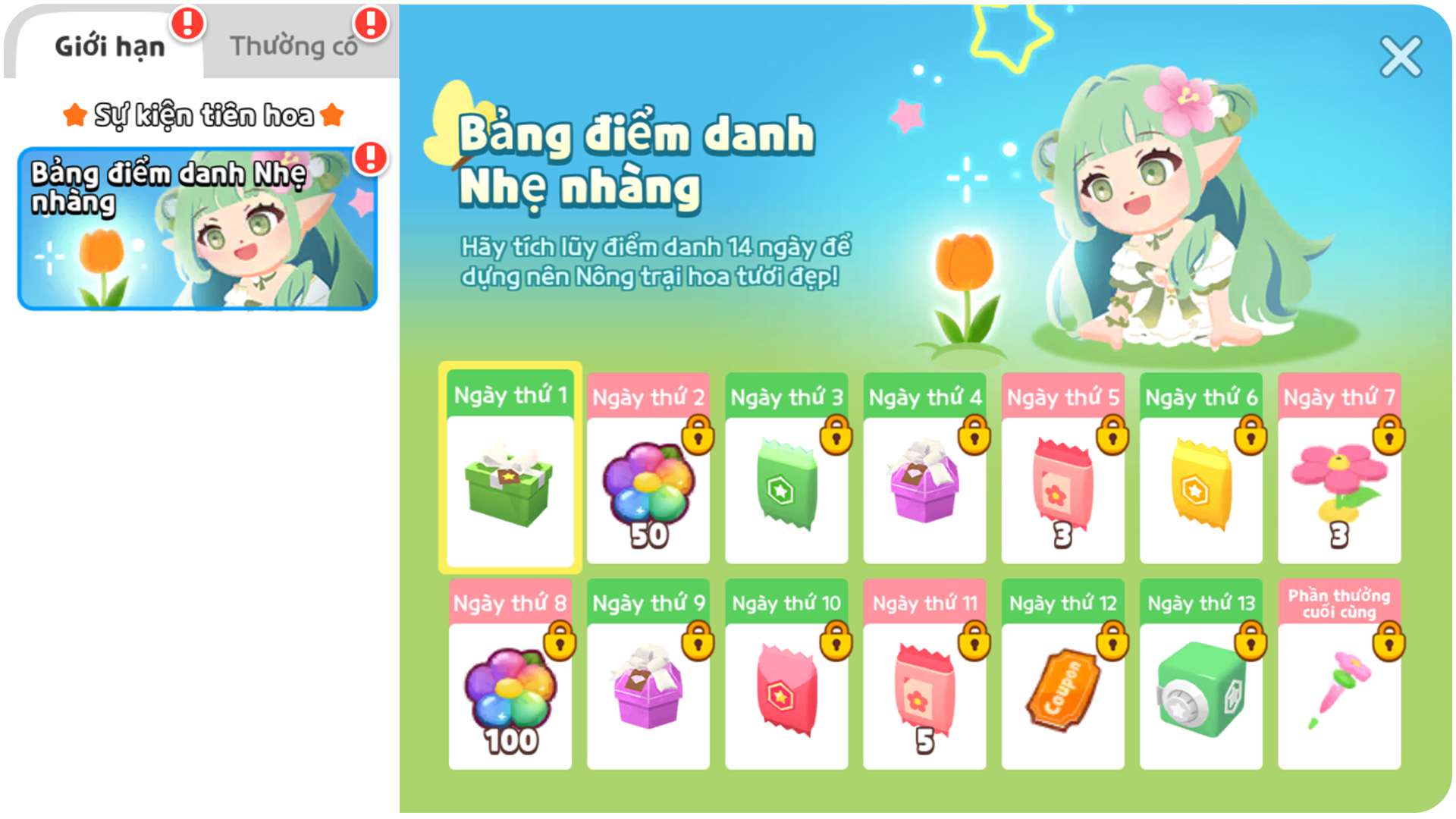 Hãy điểm danh đủ 14 ngày để xây dựng nông trại hoa rực rỡ của riêng bạn nhé!