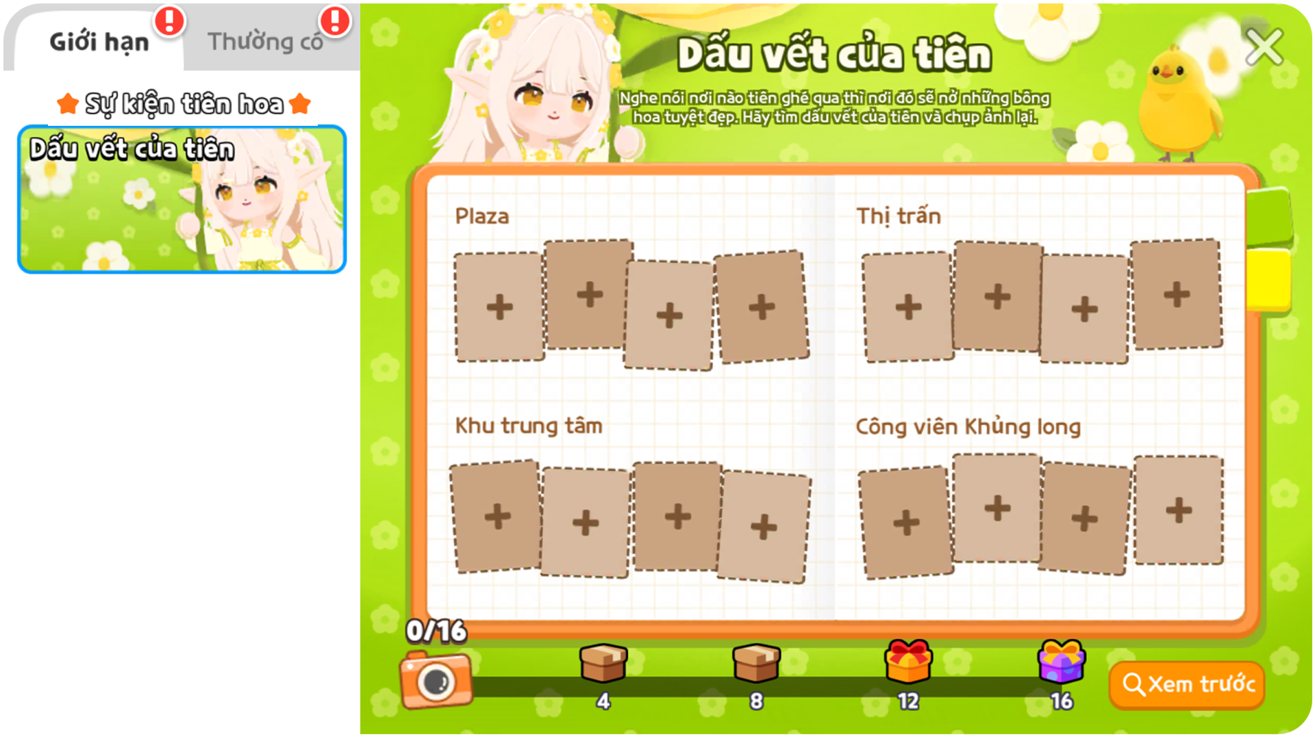 Tùy theo số lượng ảnh hoàn thành, bạn có thể nhận được Cánh hoa tiên và cả Hoa lơ lửng - một Phương tiện đặc biệt.