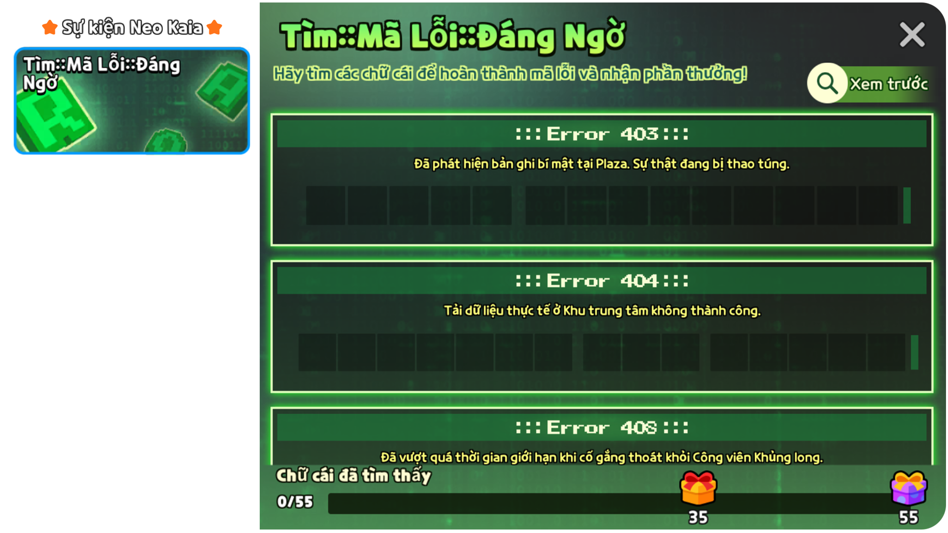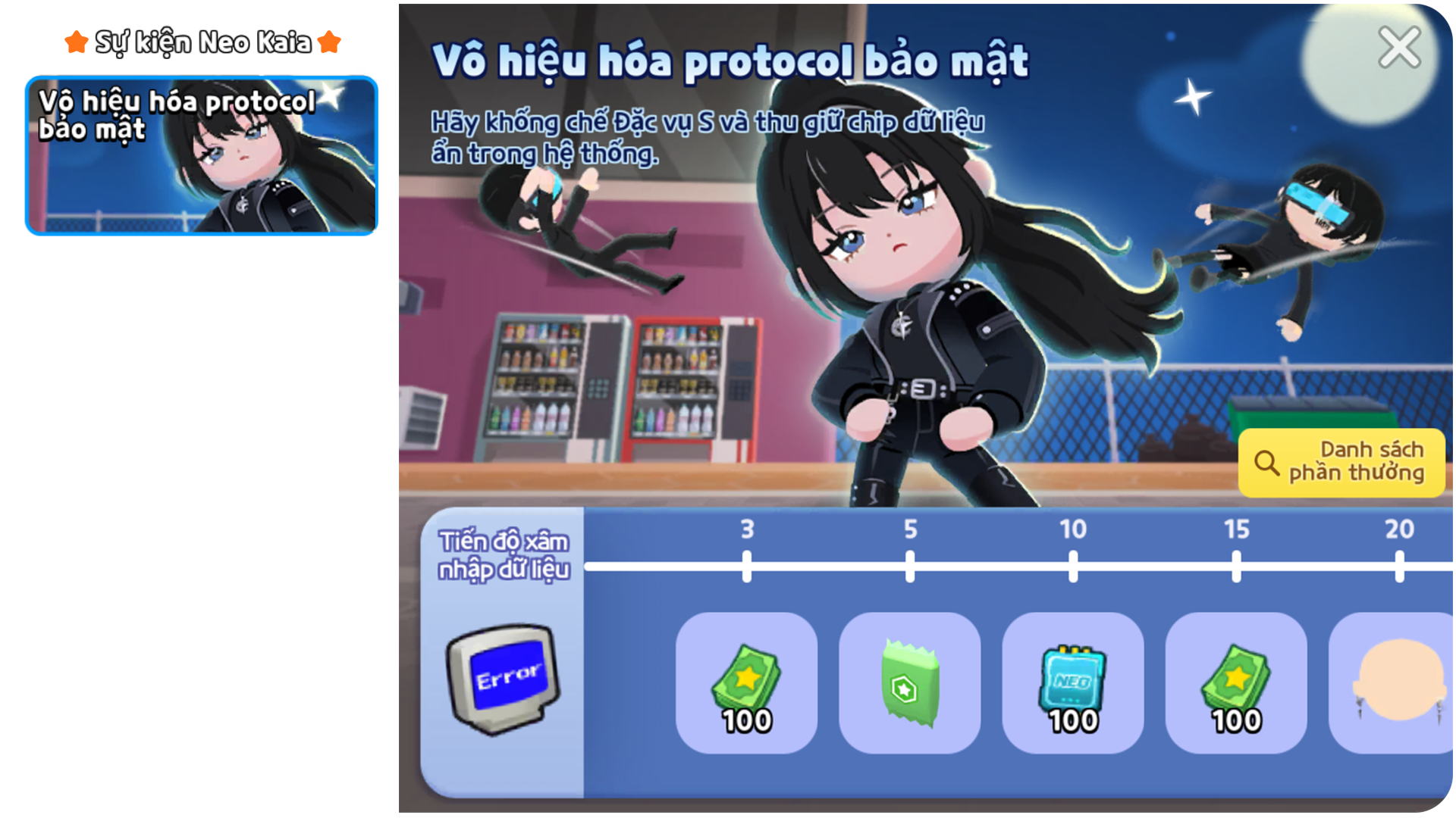 > Dựa trên mã lỗi đã hoàn thành, bạn có thể nhận “LỖI” (Bảng tên) và “Bệ trường lực bảo vệ” (Phương tiện)!